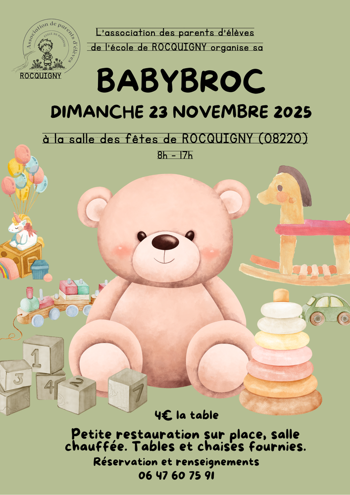 L'association des parents d'élèves de l'école de Rocquigny organise sa babybroc le dimanche 23 novembre 2025. Tarif exposants 4€/table. Salle chauffée, tables et chaises fournies. Restauration rapide. Renseignements et réservations au 0647607591