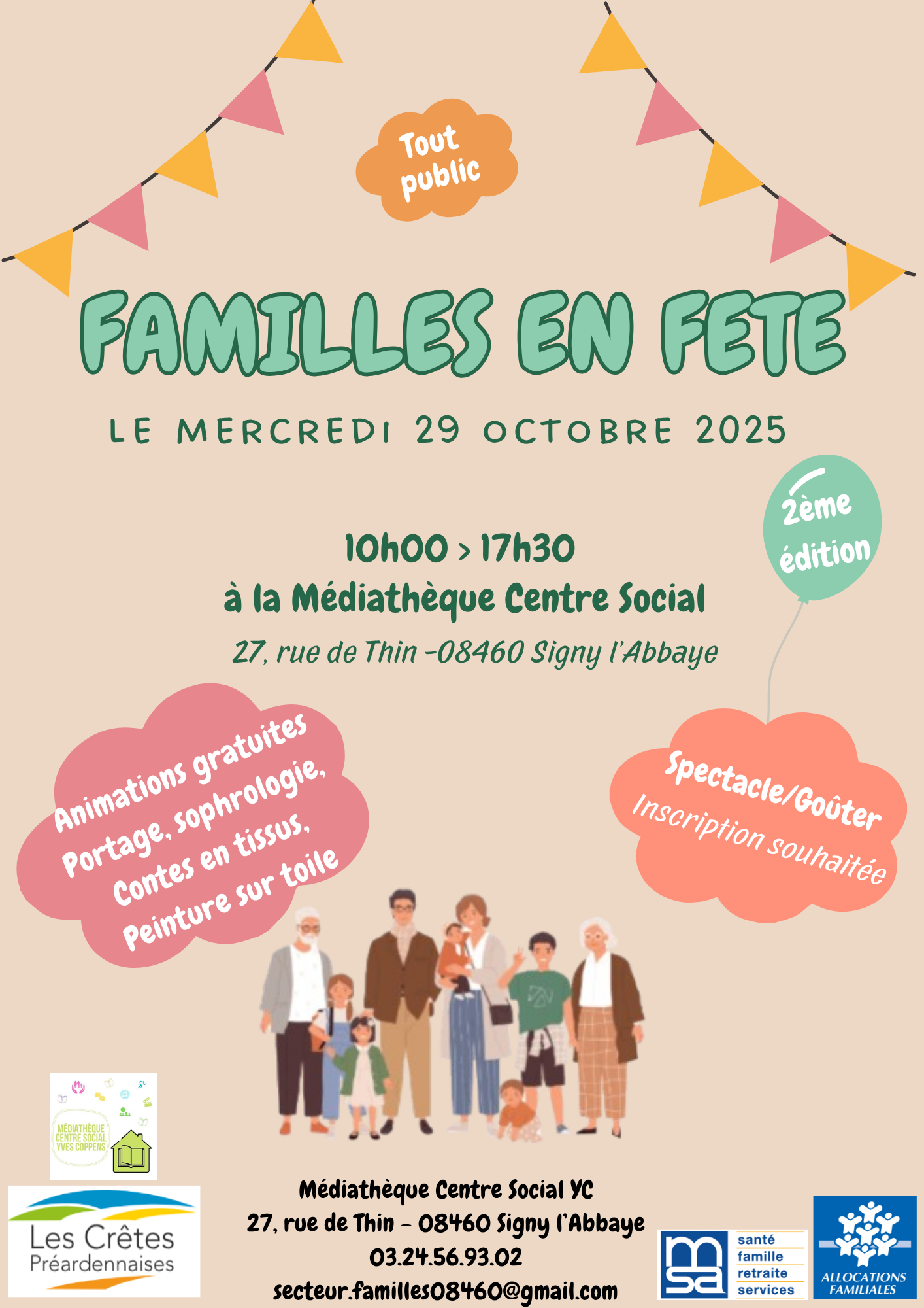 La Médiathèque Centre Social Yves Coppens organise pour sa deuxième édition, l'événement "Familles en fête". Plusieurs animations sont proposées : contes en tissus/kamishibaï, sophrologie, portage, peinture sur toile. Pour clôturer cette journée, un spectacle vous sera proposé (à destination des 3-10 ans) ainsi qu'un goûter