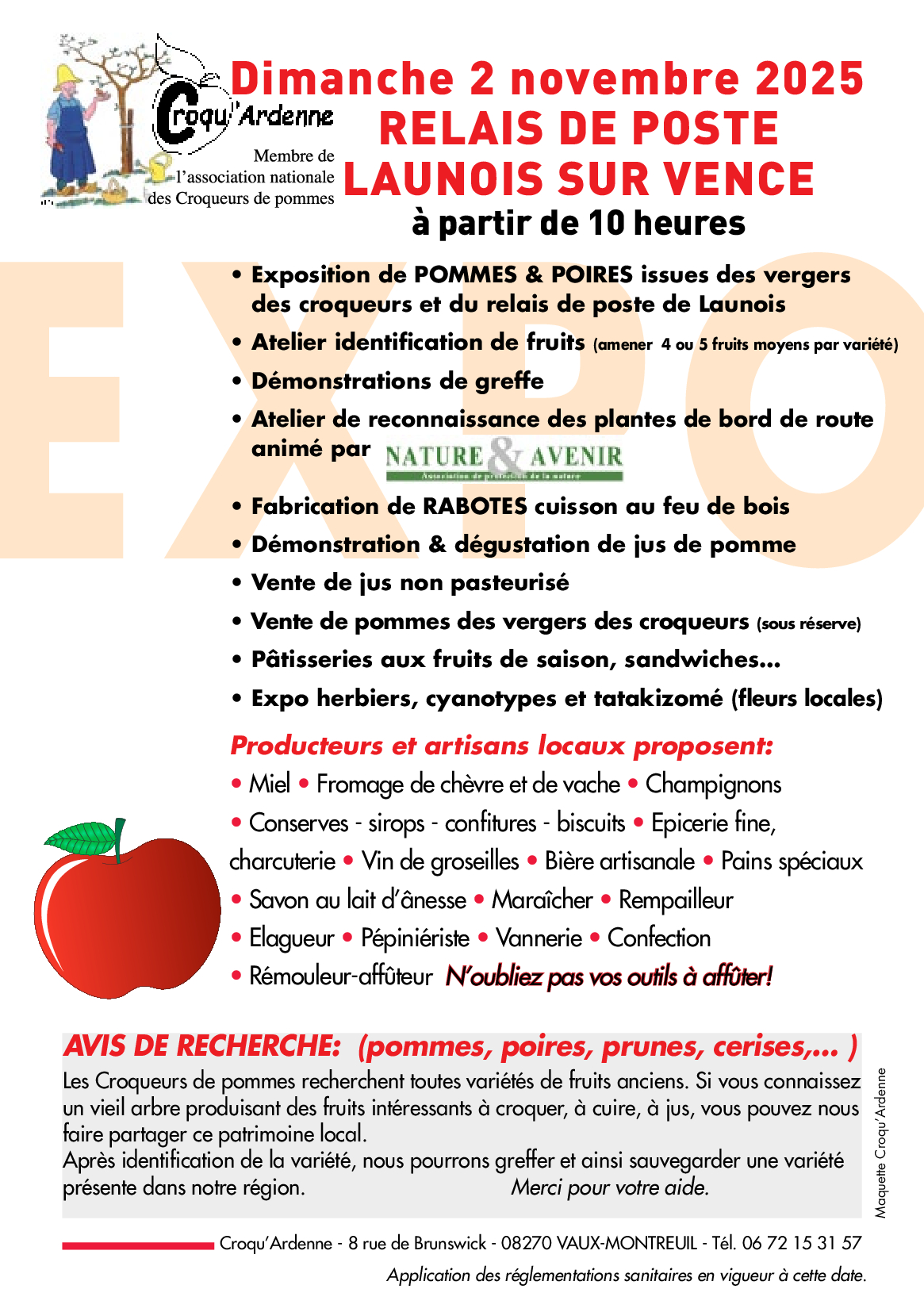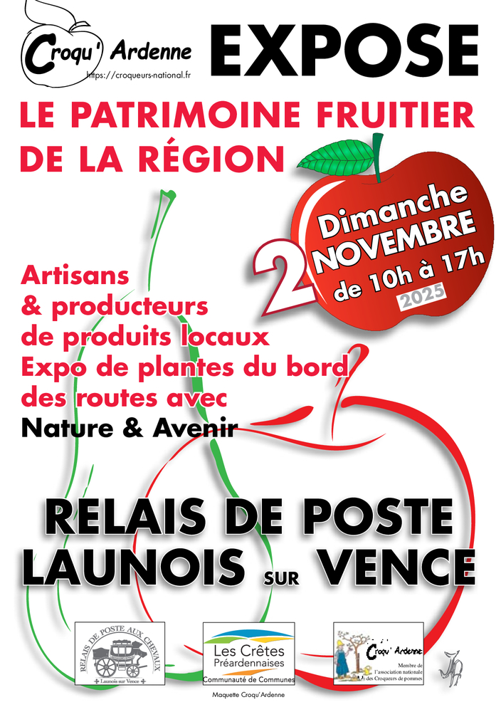 Les croqueurs de pommes des Ardennes (Croqu'Ardenne) organisent leur exposition annuelle au relais de poste de Launois-sur-Vence avec la présence de Nature et Avenir et d'une vingtaine de producteurs/artisans locaux.