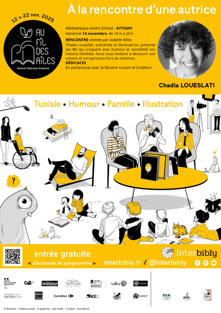 Dans le cadre du festival régional "Au fil des ailes", la médiathèque d'Attigny a la chance d'accueillir l'autrice et dessinatrice franco-tunisienne Chadia Loueslati. Lors de cette rencontre, elle évoquera son parcours hors du commun et présentera ses BD qui croquent avec humour et tendresse son histoire familiale.