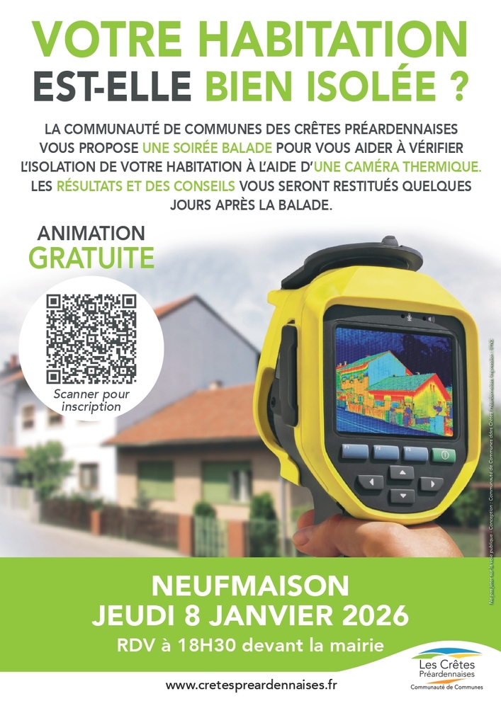 La Communauté de Communes des Crêtes Préardennaises vous propose une soirée balade pour vous aider à vérifier l'isolation de votre habitation à l'aide d'une caméra thermique.