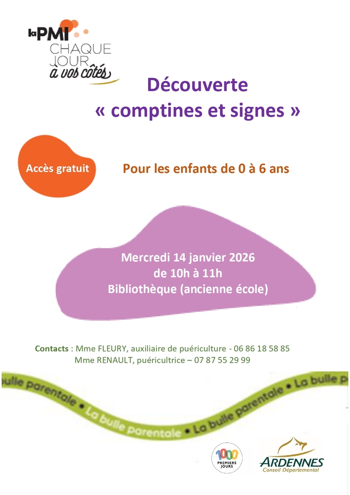 Le conseil Général, via la puéricultrice qui intervient à Vendresse dans le cadre de la PMI propose avec le soutien de la Bibliothèque un atelier "Comptines et signes". La Bibliothèque sera aussi ouverte en mode découverte. Les bibliothécaires seront heureux de vous accueillir.