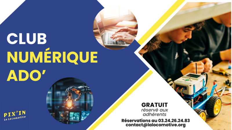 Ce samedi, on donne rendez-vous aux jeunes de 12 à 17 ans pour un club numérique d'enfer ! Accrochez-vous, car au programme : Viens apprendre à coder, utiliser nos machines, construire un robot et plus encore ! C'est un samedi par mois, à PIX'in, sur inscription ! A ne pas manquer !