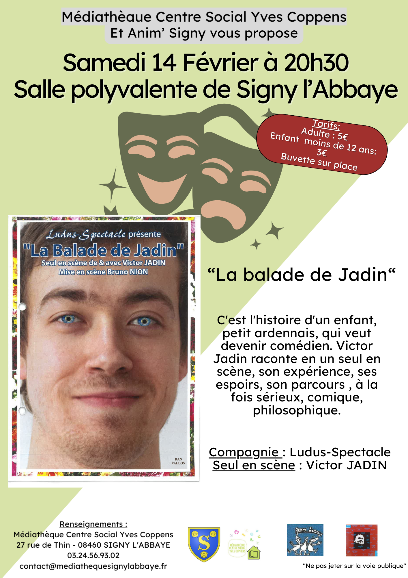 "C'est l'histoire d'un enfant, petit ardennais, qui veut devenir comédien. Victor Jadin raconte en un seul en scène, son expérience, ses espoirs, son parcours, à la fois sérieux, comique, philosophique."